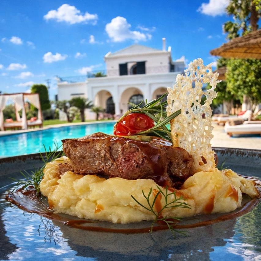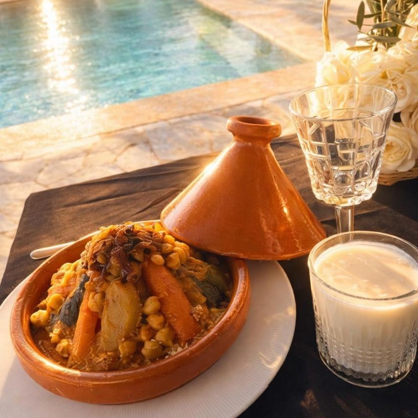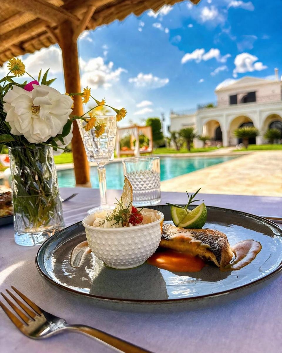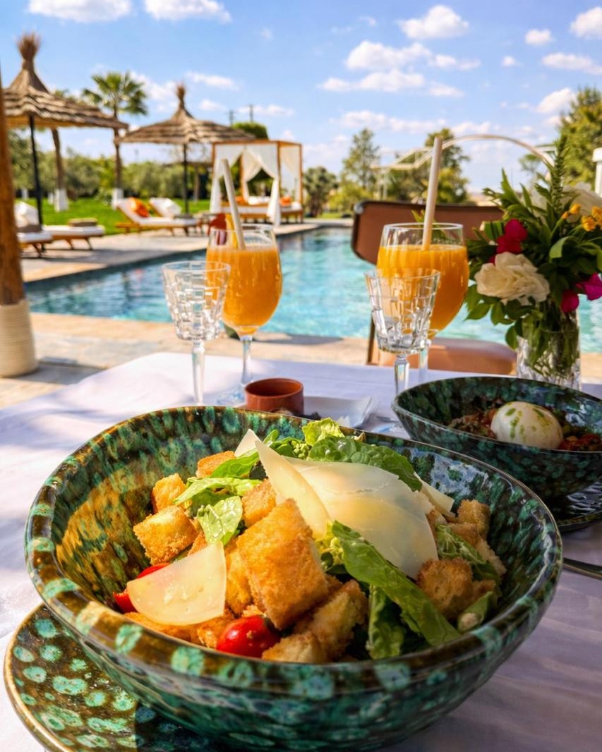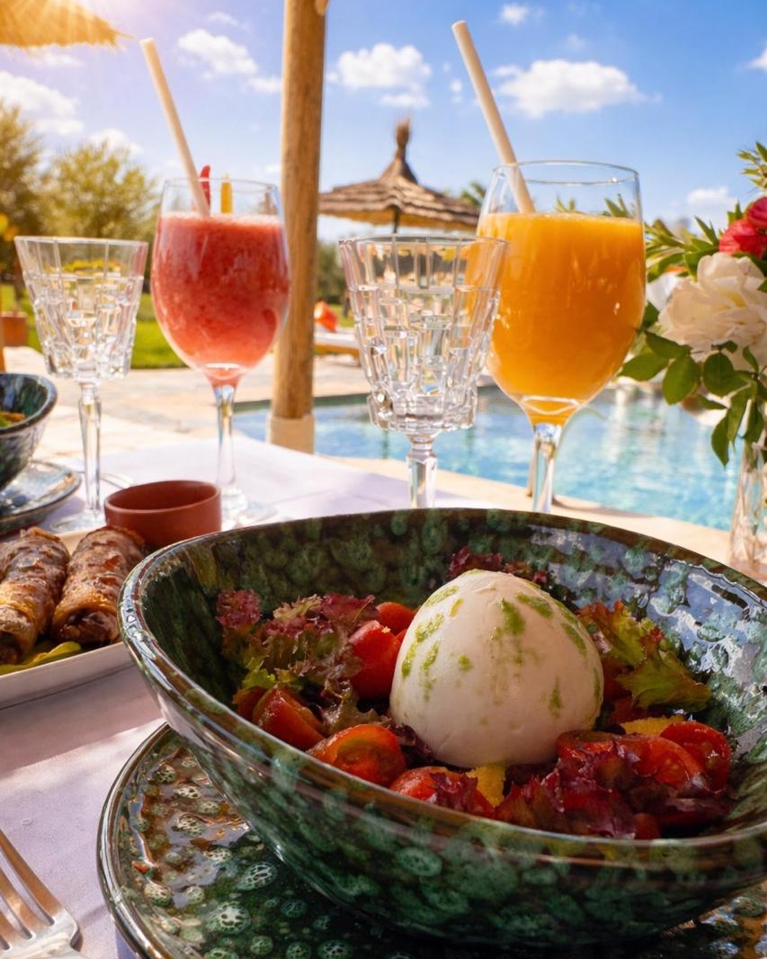 Une cuisine de saison, élaborée à partir de produits frais et locaux, mettant à l’honneur le savoir-faire beldi et les recettes traditionnelles marocaines, tout en intégrant des inspirations internationales. La carte, évolutive au fil des saisons, propose des plats authentiques, simples et accessibles, pensés pour s’adapter à tous les goûts. Des options végétariennes ainsi que des adaptations spécifiques (allergies, régimes particuliers) sont proposées sur demande.